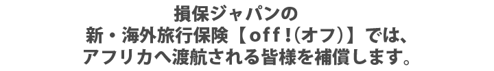 万が一の時はご自身だけでなく、ご家族等も金銭的負担を強いられるケースもありますので、アフリカへ渡航の際は損保ジャパンのoff!にお申込みのうえ、お出かけください。