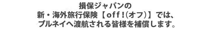 万が一の時はご自身だけでなく、ご家族等も金銭的負担を強いられるケースもありますので、ブルネイへ渡航の際は損保ジャパンのoff!にお申込みのうえ、お出かけください。