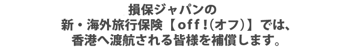 万が一の時はご自身だけでなく、ご家族等も金銭的負担を強いられるケースもありますので、香港へ渡航の際は損保ジャパンのoff!にお申込みのうえ、お出かけください。