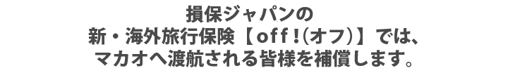 万が一の時はご自身だけでなく、ご家族等も金銭的負担を強いられるケースもありますので、マカオへ渡航の際は損保ジャパンのoff!にお申込みのうえ、お出かけください。