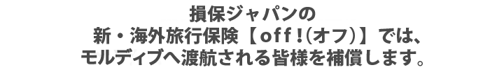万が一の時はご自身だけでなく、ご家族等も金銭的負担を強いられるケースもありますので、モルディブへ渡航の際は損保ジャパンのoff!にお申込みのうえ、お出かけください。