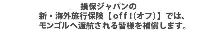 万が一の時はご自身だけでなく、ご家族等も金銭的負担を強いられるケースもありますので、モンゴルへ渡航の際は損保ジャパンのoff!にお申込みのうえ、お出かけください。