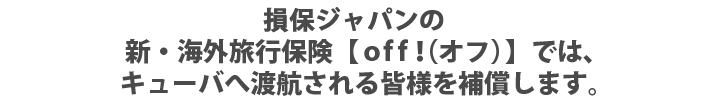 万が一の時はご自身だけでなく、ご家族等も金銭的負担を強いられるケースもありますので、キューバへ渡航の際は損保ジャパンのoff!にお申込みのうえ、お出かけください。