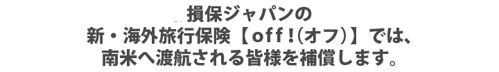 万が一の時はご自身だけでなく、ご家族等も金銭的負担を強いられるケースもありますので、南米へ渡航の際は損保ジャパンのoff!にお申込みのうえ、お出かけください。