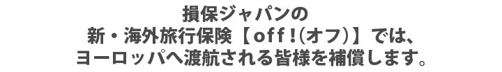 万が一の時はご自身だけでなく、ご家族等も金銭的負担を強いられるケースもありますので、ヨーロッパへ渡航の際は損保ジャパンのoff!にお申込みのうえ、お出かけください。