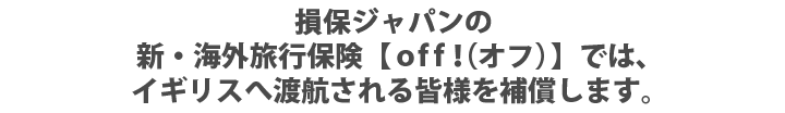 万が一の時はご自身だけでなく、ご家族等も金銭的負担を強いられるケースもありますので、イギリスへ渡航の際は損保ジャパンのoff!にお申込みのうえ、お出かけください。