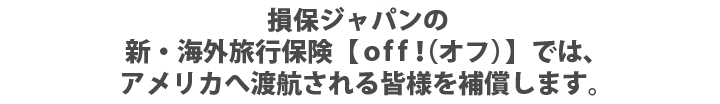万が一の時はご自身だけでなく、ご家族等も金銭的負担を強いられるケースもありますので、アメリカへ渡航の際は損保ジャパンのoff!にお申込みのうえ、お出かけください。