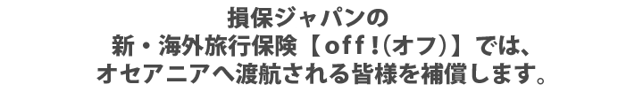 万が一の時はご自身だけでなく、ご家族等も金銭的負担を強いられるケースもありますので、オセアニアへ渡航の際は損保ジャパンのoff!にお申込みのうえ、お出かけください。